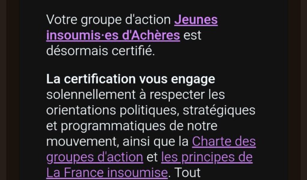 Le Groupe d’Action des jeunes insoumis•es d’Achères vient d’être certifié !